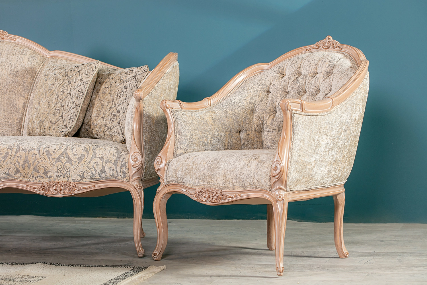 مبلی نئوکلاسیک با منبت‌های ظریف، خطوط منحنی و پارچه‌های مخمل باکیفیت که فضایی صمیمی و در عین حال شیک به پذیرایی شما می‌بخشد. انتخابی برای کسانی که زیبایی مینیمال را در کنار وقار کلاسیک می‌خواهند.