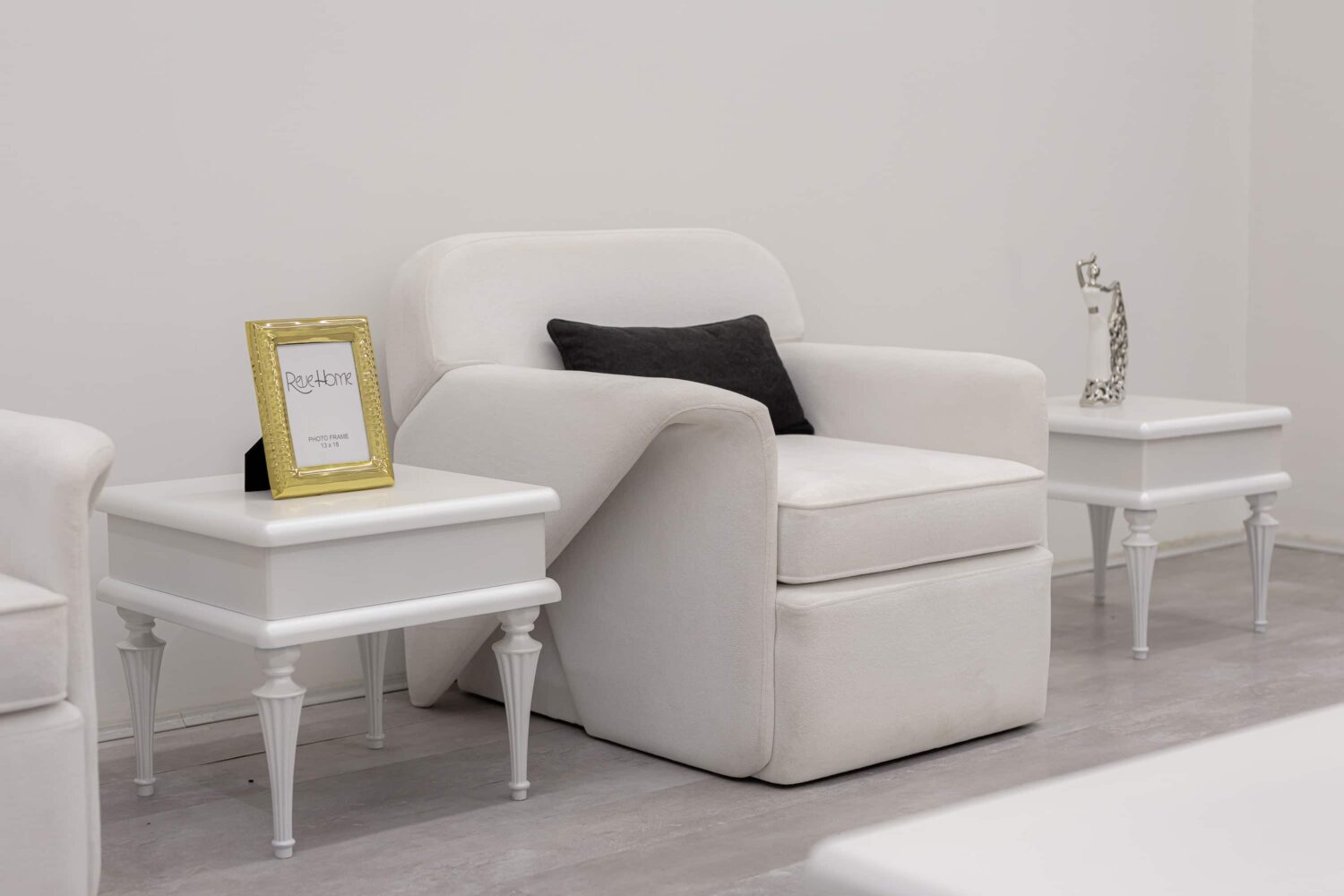 | میز وسط | سفید و هماهنگ با مبل، برجستهکننده هارمونی رنگ و فرم |