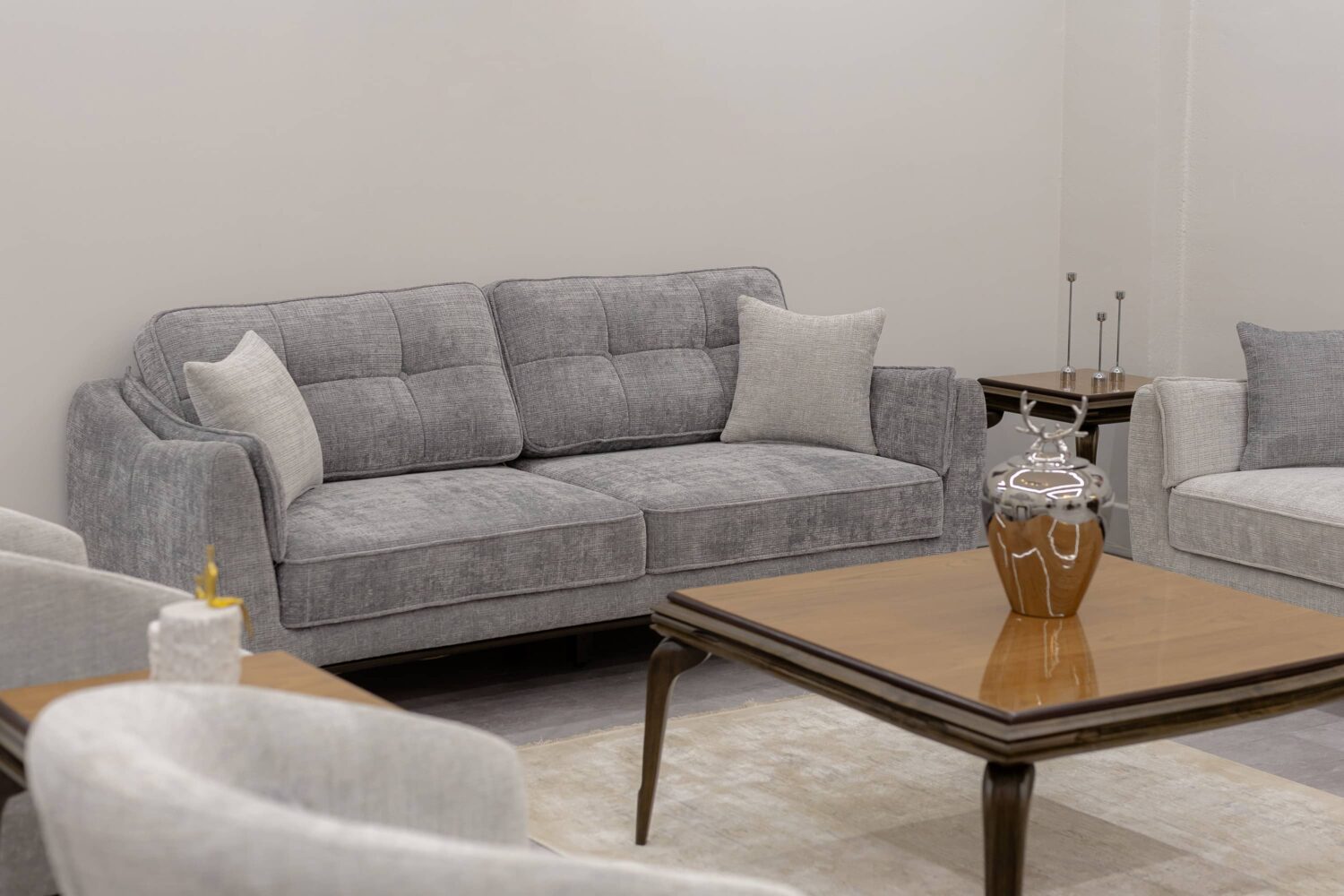 رنگ اصلی این مدل، طوسی خنثی و شیک است؛ رنگی که به‌راحتی با بیشتر سبک‌های دکوراسیون مدرن گرفته تا کلاسیک ساده هماهنگ می‌شود. پایه‌های چوبی طبیعی یا پوشش‌هایی مانند قهوه‌ای تیره، سفید پتینه و زیتونی ملایم، ترکیبی متعادل و چشم‌پسند ایجاد می‌کنند. برای کسانی که به دنبال کمی تنوع و کنتراست هستند، افزودن کوسن‌ها یا صندلی‌هایی با رنگ‌های زرد خردلی، سبز زیتونی یا کرم روشن می‌تواند جلوه‌ای تازه و گرم به فضا ببخشد