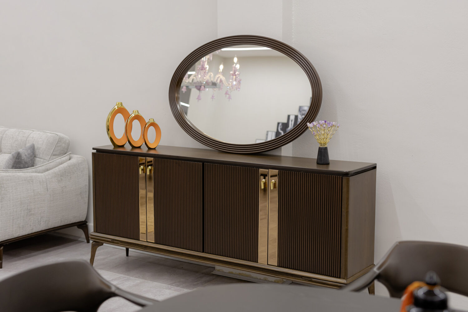طراحی این کنسول و میز TV، با خطوط مینیمال، ظرافت فوقالعاده در ساخت و استفاده از آینه بیضی خوشفرم، جلوهای شیک، سبک و متفاوت ایجاد کرده است.